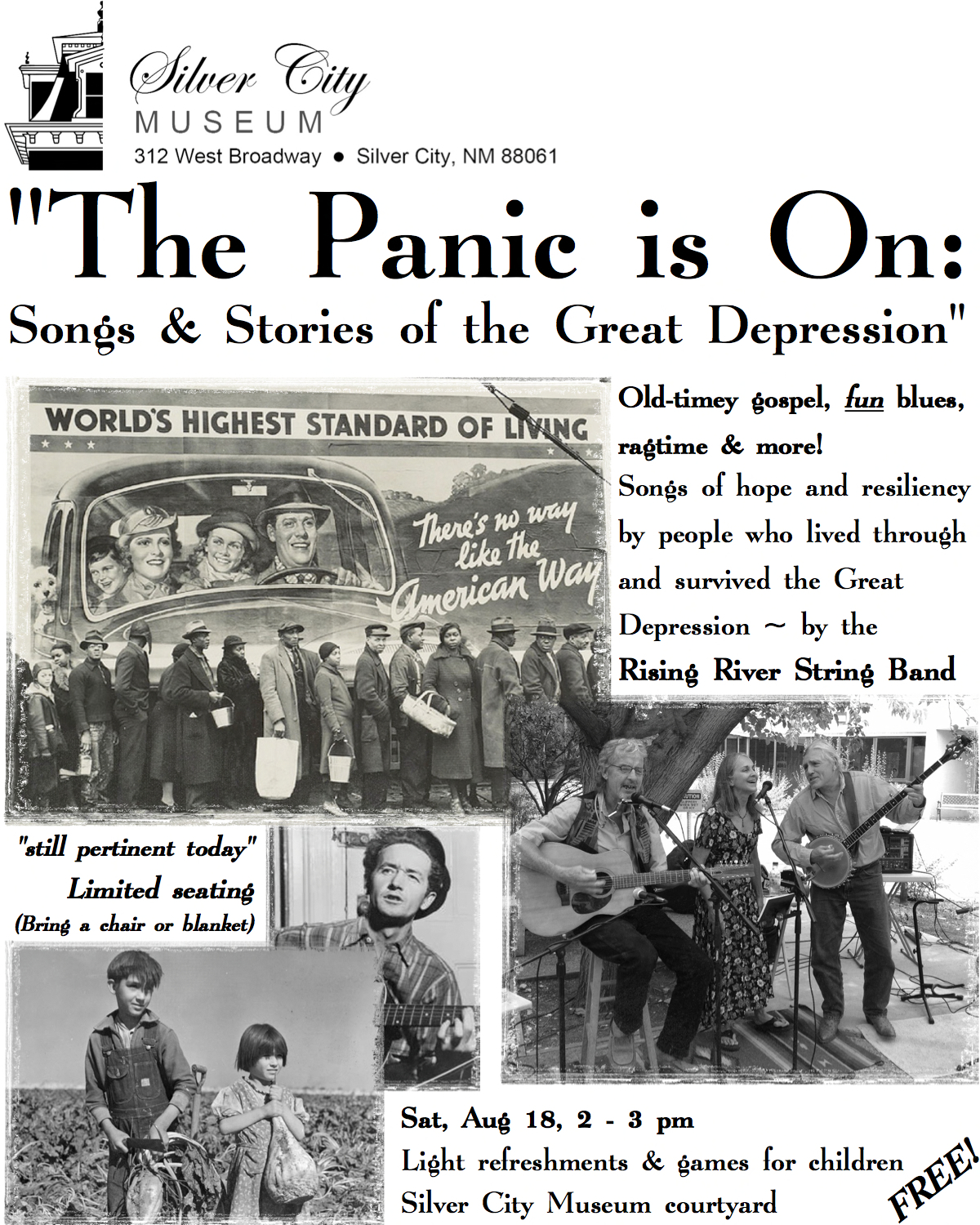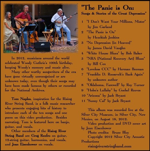 Graphic Arts Rising River String Band’s first CD cover: A Rising River String Band / Silver City Museum poster: My new design for a Greg Renfro re-released CD cover (and my photography): The “Panic is On” DVD cover: Share this: Click to share on Facebook (Opens in new window) Facebook Click to share on Pinterest (Opens in new window) Pinterest Click to share on LinkedIn (Opens in new window) LinkedIn Click to email a link to a friend (Opens in new window) Email Click to share on X (Opens in new window) X More Click to share on Pocket (Opens in new window) Pocket Click to share on Tumblr (Opens in new window) Tumblr Click to share on Reddit (Opens in new window) Reddit Click to print (Opens in new window) Print Like Loading...